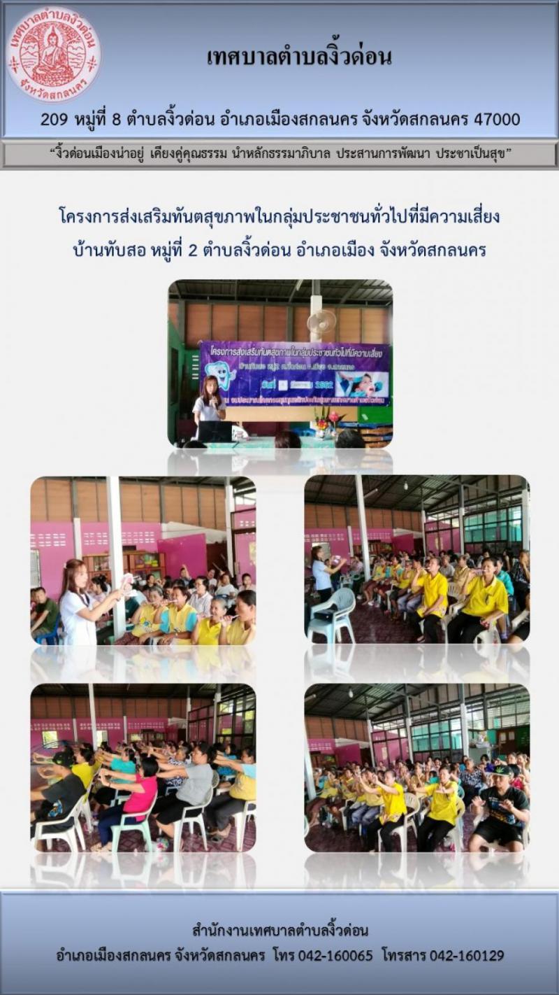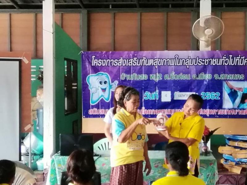 โครงการส่งเสริมทันตสุขภาพในกลุ่มประชาชนทั่วไปที่มีความเสี่ยงบ้านทับสอ หมู่ที่ 2 ตำบลงิ้วด่อน อำเภอเมือง จังหวัดสกลนคร (20 ภาพ)
