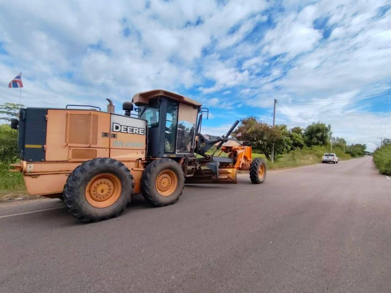 นายถนอม สมผล ลงพื้นที่ตรวจสอบการดำเนินการปรับปรุงไหล่ทางโดยกำจัดวัชพืช สองข้างทางถนนสายกกกอก-พังเม็ก