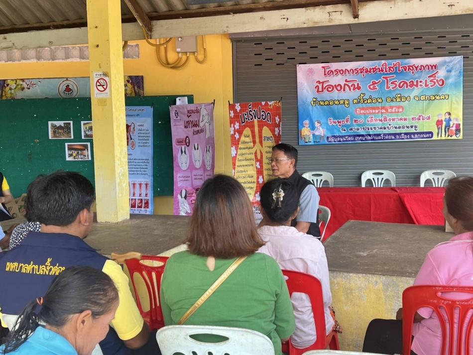 นายกเทศมนตรีตำบลงิ้วด่อนพร้อมด้วยรองนายกเทศมนตรีตำบลงิ้วด่อน เลขานุการนายกเทศมนตรีตำบลงิ้วด่อน สมาชิกสภาเทศบาลตำบลงิ้วด่อน เปิดโครงการชุมชนใส่ใจสุขภาพ ป้องกัน 5 โรคมะเร็ง บ้านดอนหมู ณ ศาลาประชาคมบ้านดอนหมู [20 สิงหาคม 2568]