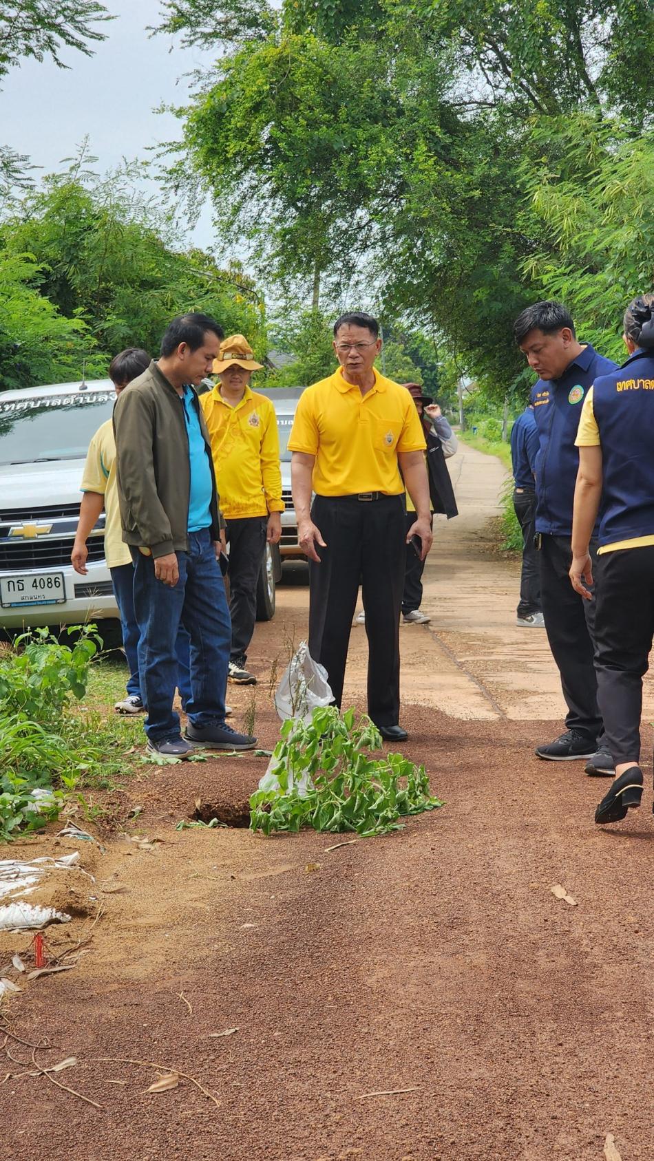นายถนอม สมผล นายกเทศมนตรีตำบลงิ้วด่อนพร้อมด้วยเจ้าหน้าที่กองช่างลงพื้นที่ตรวจสอบถนนชำรุดทรุดตัวเป็นโพรงลึก [6 สิงหาคม 2568]