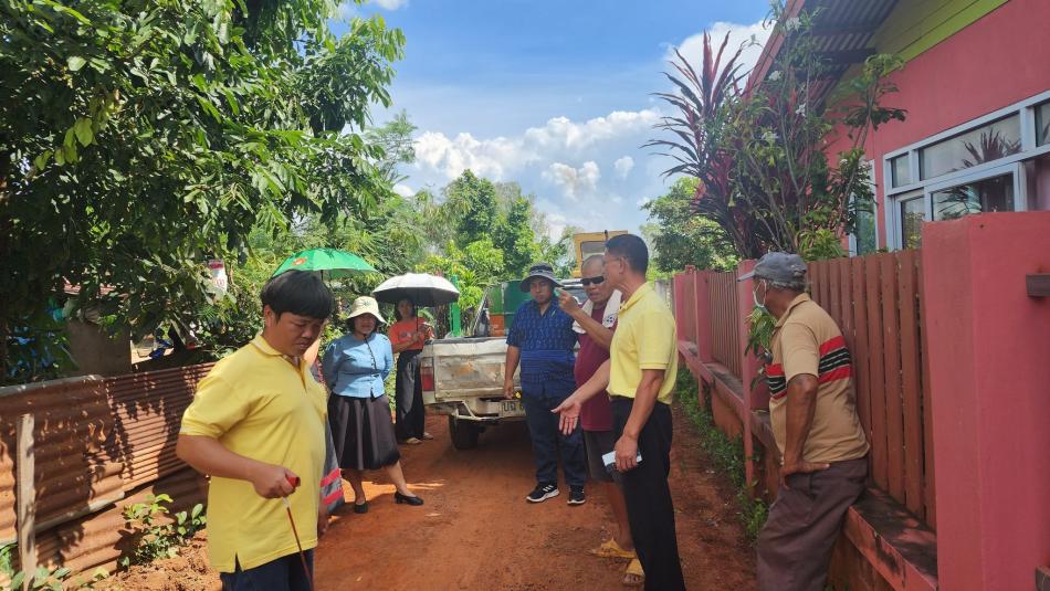 นายถนอม สมผล นายกเทศมนตรีตำบลงิ้วด่อน พร้อมเจ้าหน้าที่กองช่างและคณะกรรมการตรวจการจ้างลงตรวจสอบการดำเนินการก่อสร้างถนนคอนกรีตซอยหนองจ่าโท [5 สิงหาคม 2568]