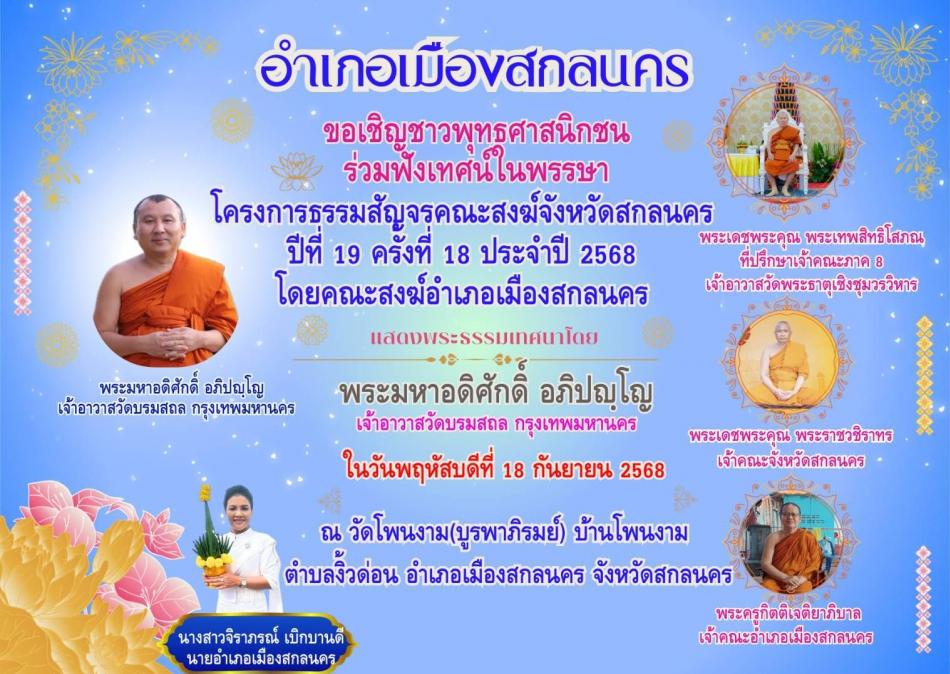 เทศบาลตำบลงิ้วด่อนขอเชิญชวนชาวพุทธศาสนิกชนร่วมฟังเทศน์ในพรรษา โครงการธรรมะสัญจรคณะสงฆ์จังหวัดสกลนครปีที่ 19 ครั้งที่ 18 ประจำปี 2568 ณวัดบ้านโพนงาม(บูรพาภิรมย์)หมู่ที่ 9 ตำบลงิ้วด่อน อำเภอเมืองสกลนคร ... [16 กันยายน 2568]