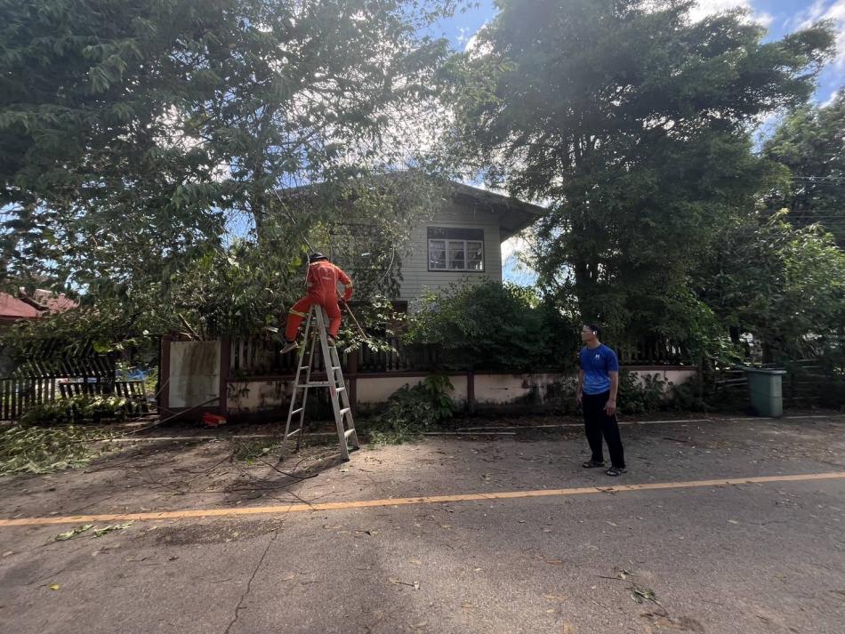 นายถนอม สมผล พร้อมทีมเจ้าหน้าที่งานป้องกันและงานกู้ภัยเทศบาลตำบลงิ้วด่อนออกดำเนินการตัดต้นไม้ กิ่งไม้ที่หักทับสายไฟฟ้าในหมู่บ้าน บ้านโพนงาม หมู่ที่ 9 [13 กันยายน 2568]