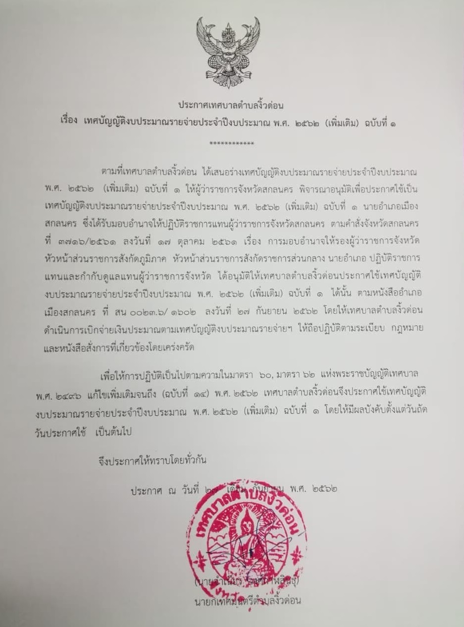 เรื่อง เทศบัญญัติงบประมาณรายจ่ายประจำปีงบประมาณ พ.ศ. 2562 (เพิ่มเติมฉบับที่ 1)