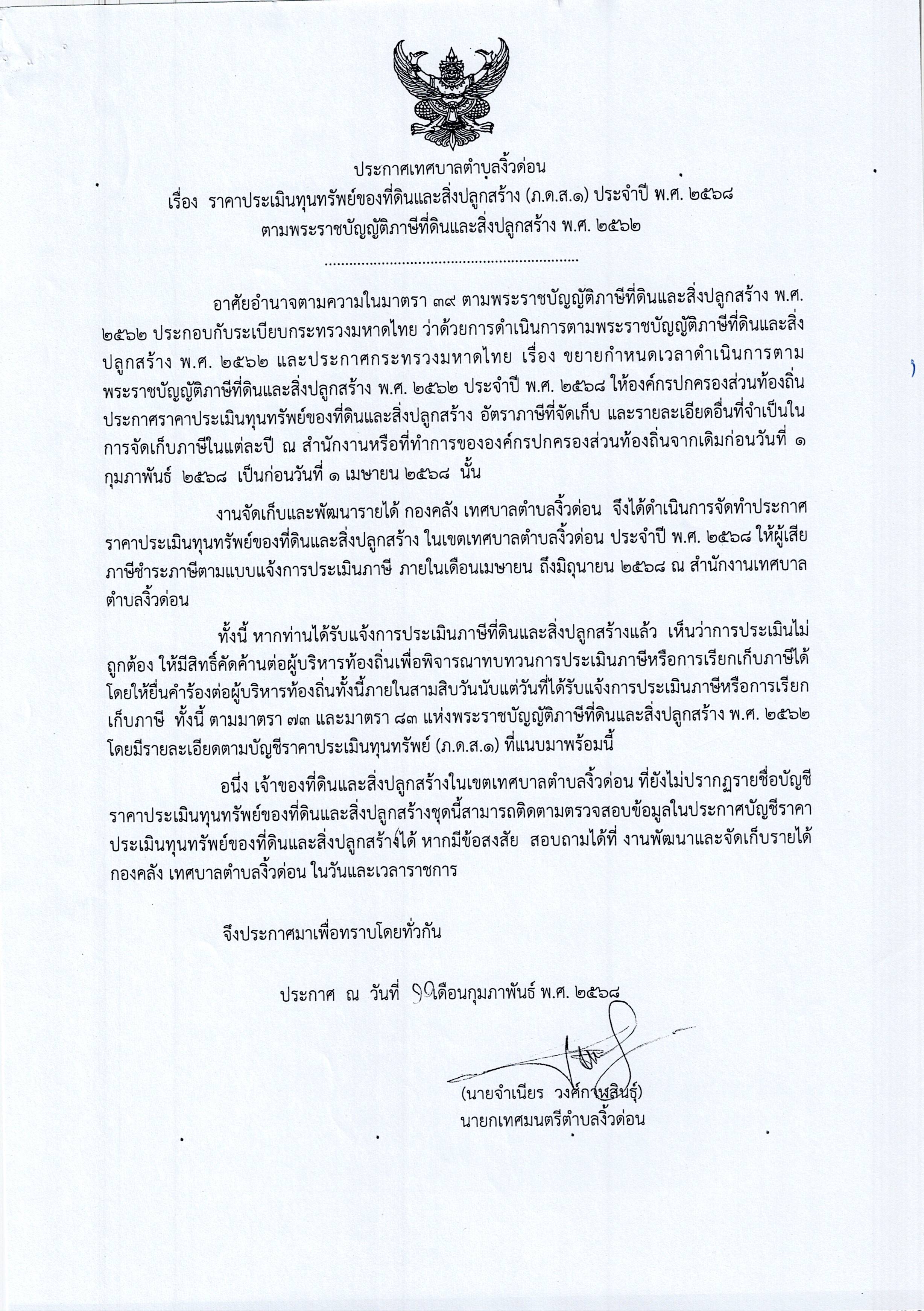 เรื่อง ประเมินราคาทุนทรัพย์ของที่ดินและสิ่งปลูกสร้าง(ภ.ด.ส.1)ประจำปี พ.ศ. 2568 ตามพระราชบัญญัติภาษีที่ดินและสิ่งปลูกสร้าง พ.ศ. 2562