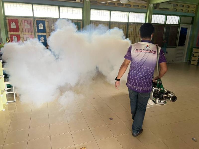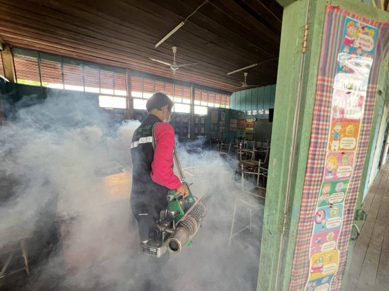 งานสาธารณสุขออกพ่นหมอกควันกำจัดยุงตัวเต็มวัยและสำรวจลูกน้ำยุงลาย ตามโครงการควบคุมและป้องกันโรคไข้เลือดออก ประจำปีงบประมาณ 2568 ณ โรงเรียนนายอวัฒนา ตำบลงิ้วด่อน