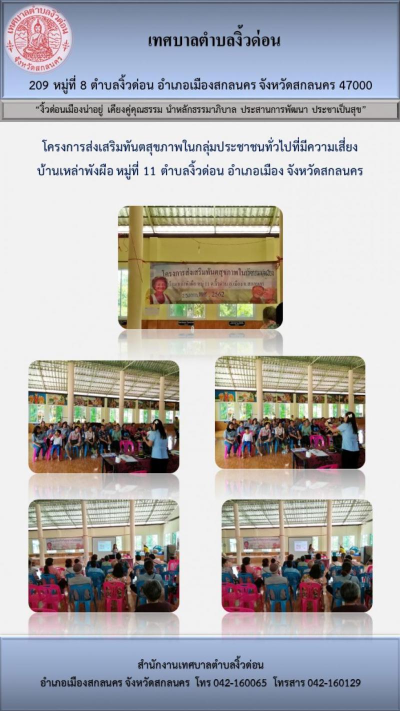 โครงการส่งเสริมทันตสุขภาพในกลุ่มประชาชนทั่วไปที่มีความเสี่ยง บ้านเหล่าพังผือ หมู่ที่ 11 ตำบลงิ้วด่อน อำเภอเมือง จังหวัดสกลนคร (6 ภาพ)