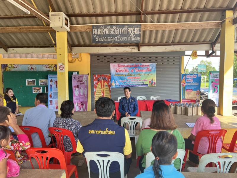 นายกเทศมนตรีตำบลงิ้วด่อนพร้อมด้วยรองนายกเทศมนตรีตำบลงิ้วด่อน เลขานุการนายกเทศมนตรีตำบลงิ้วด่อน สมาชิกสภาเทศบาลตำบลงิ้วด่อน เปิดโครงการชุมชนใส่ใจสุขภาพ ป้องกัน 5 โรคมะเร็ง บ้านดอนหมู ณ ศาลาประชาคมบ้านดอนหมู