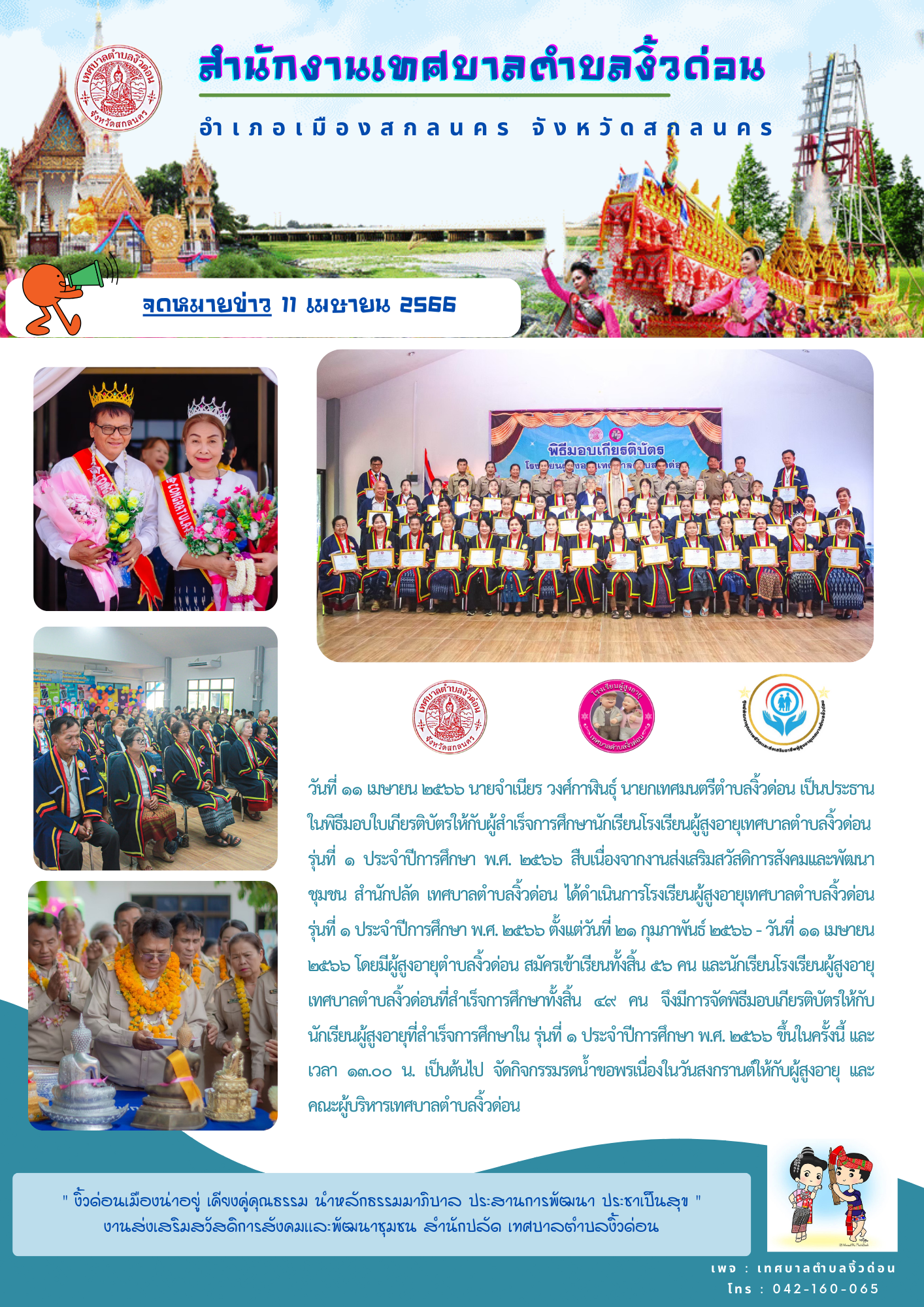 รายละเอียด : วันที่ ๑๑ เมษายน ๒๕๖๖ นายจำเนียร วงศ์กาฬินธุ์ นายกเทศมนตรีตำบลงิ้วด่อน เป็นประธานในพิธีมอบใบเกียรติบัตรให้กับผู้สำเร็จการศึกษานักเรียนโรงเรียนผู้สูงอายุเทศบาลตำบลงิ้วด่อน รุ่นที่ ๑ ประจำปีการศึกษา พ.ศ. ๒๕๖๖ สืบเนื่องจากงานส่งเสริมสวัสดิการสังคมเเละพัฒนาชุมชน สำนักปลัด เทศบาลตำบลงิ้วด่อน ได้ดำเนินการโรงเรียนผู้สูงอายุเทศบาลตำบลงิ้วด่อน รุ่นที่ ๑ ประจำปีการศึกษา พ.ศ. ๒๕๖๖ ตั้งเเต่วันที่ ๒๑ กุมภาพันธ์ ๒๕๖๖ - วันที่ ๑๑ เมษายน ๒๕๖๖ โดยมีผู้สูงอายุตำบลงิ้วด่อน สมัครเข้าเรียนทั้งสิ้น ๕๖ คน เเละนักเรียนโรงเรียนผู้สูงอายุเทศบาลตำบลงิ้วด่อนที่สำเร็จการศึกษาทั้งสิ้น ๔๙ คน จึงมีการจัดพิธีมอบเกียรติบัตรให้กับนักเรียนผู้สูงอายุที่สำเร็จการศึกษาใน รุ่นที่ ๑ ประจำปีการศึกษา พ.ศ. ๒๕๖๖ ขึ้นในครั้งนี้ เเละเวลา ๑๓.๐๐ น. เป็นต้นไป จัดกิจกรรมรดน้ำขอพรเนื่องในวันสงกรานต์ให้กับผู้สูงอายุ เเละคณะผู้บริหารเทศบาลตำบลงิ้วด่อน