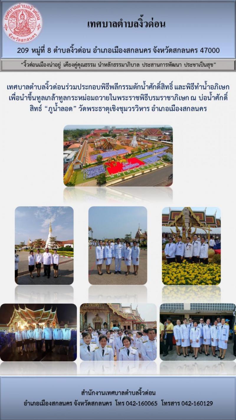 เทศบาลตำบลงิ้วด่อนร่วมประกอบพิธีพลีกรรมตักน้ำศักดิ์สิทธิ์ และพิธีทำน้ำอภิเษก เพื่อนำขึ้นทูลเกล้าทูลกระหม่อมถวายในพระราชพิธีบรมราชาภิเษก ณ บ่อน้ำศักดิ์สิทธ์ “ภูน้ำลอด” วัดพระธาตุเชิงชุมวรวิหาร อำเภอเมืองสกลนคร (32 ภาพ )