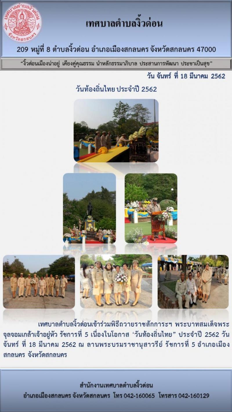 เทศบาลตำบลงิ้วด่อนเข้าร่วมพิธีถวายราชสักการะฯ พระบาทสมเด็จพระจุลจอมเกล้าเจ้าอยู่หัว รัชการที่ 5 เนื่องในโอกาส ‘วันท้องถิ่นไทย” ประจำปี 2562 (13 ภาพ)