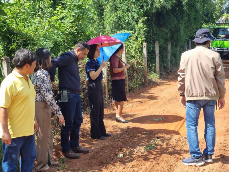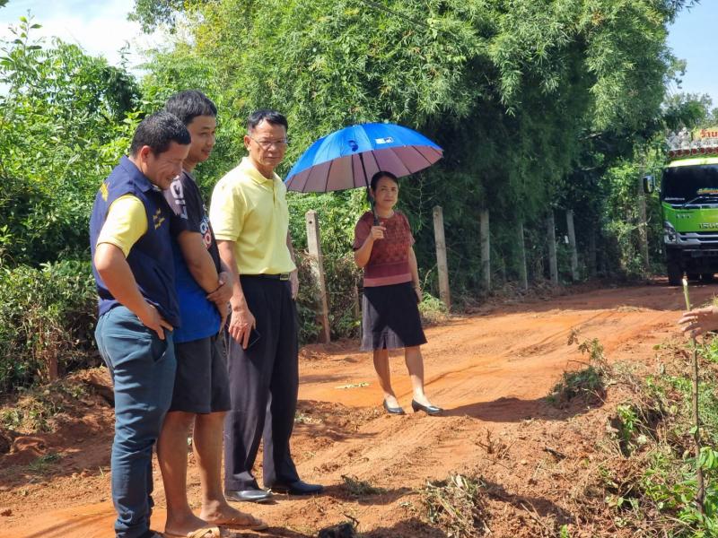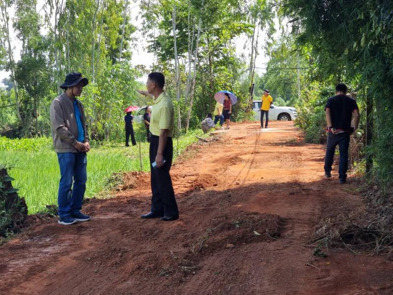 นายถนอม สมผล นายกเทศมนตรีตำบลงิ้วด่อน พร้อมเจ้าหน้าที่กองช่างและคณะกรรมการตรวจการจ้างลงตรวจสอบการดำเนินการก่อสร้างถนนคอนกรีตซอยหนองจ่าโท