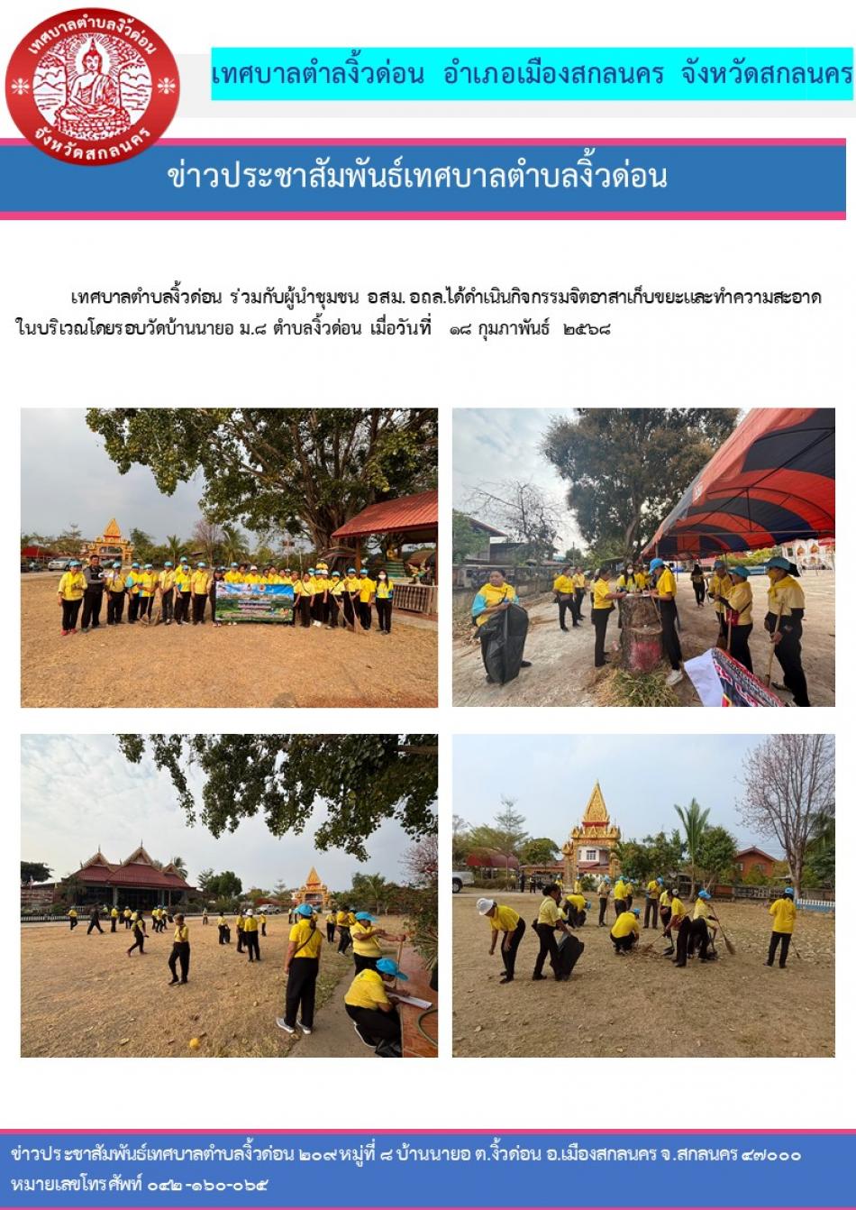 กิจกรรมจิตอาสาเก็บขยะและทำความสะอาดบริเวณโดยรอบวัดบ้านนายอ หมู่ที่8 ตำบลงิ้วด่อน [18 กุมภาพันธ์ 2568]