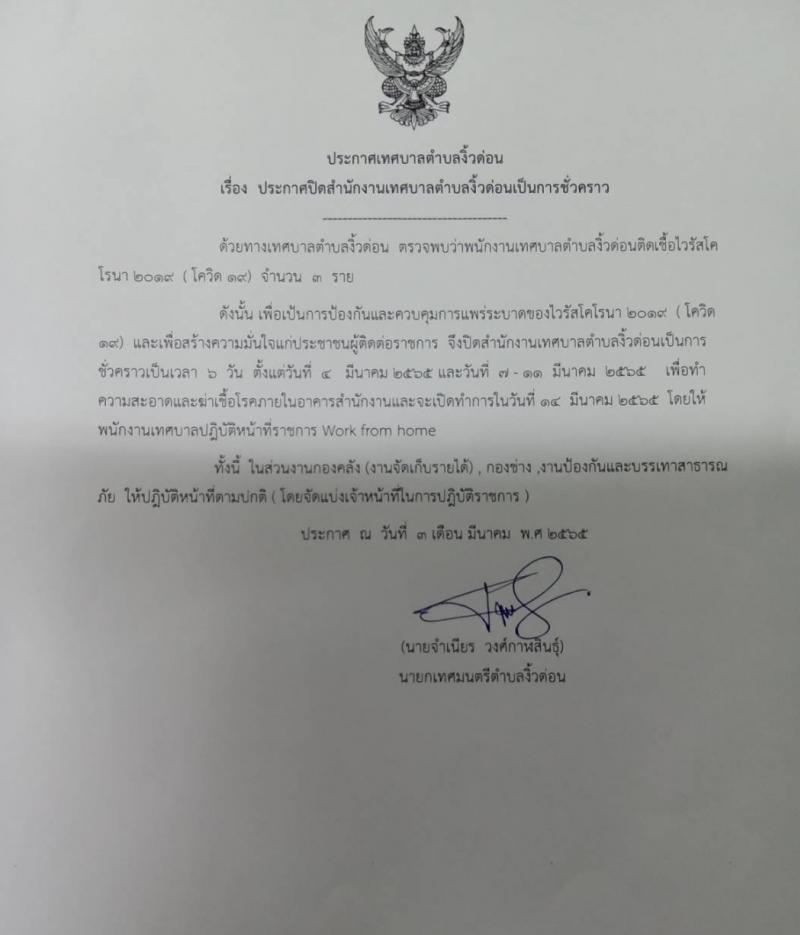 ประกาศปิดสำนักงานเทศบาลตำบลงิ้วด่อนเป็นการชั่วคราว [3 มีนาคม 2565]