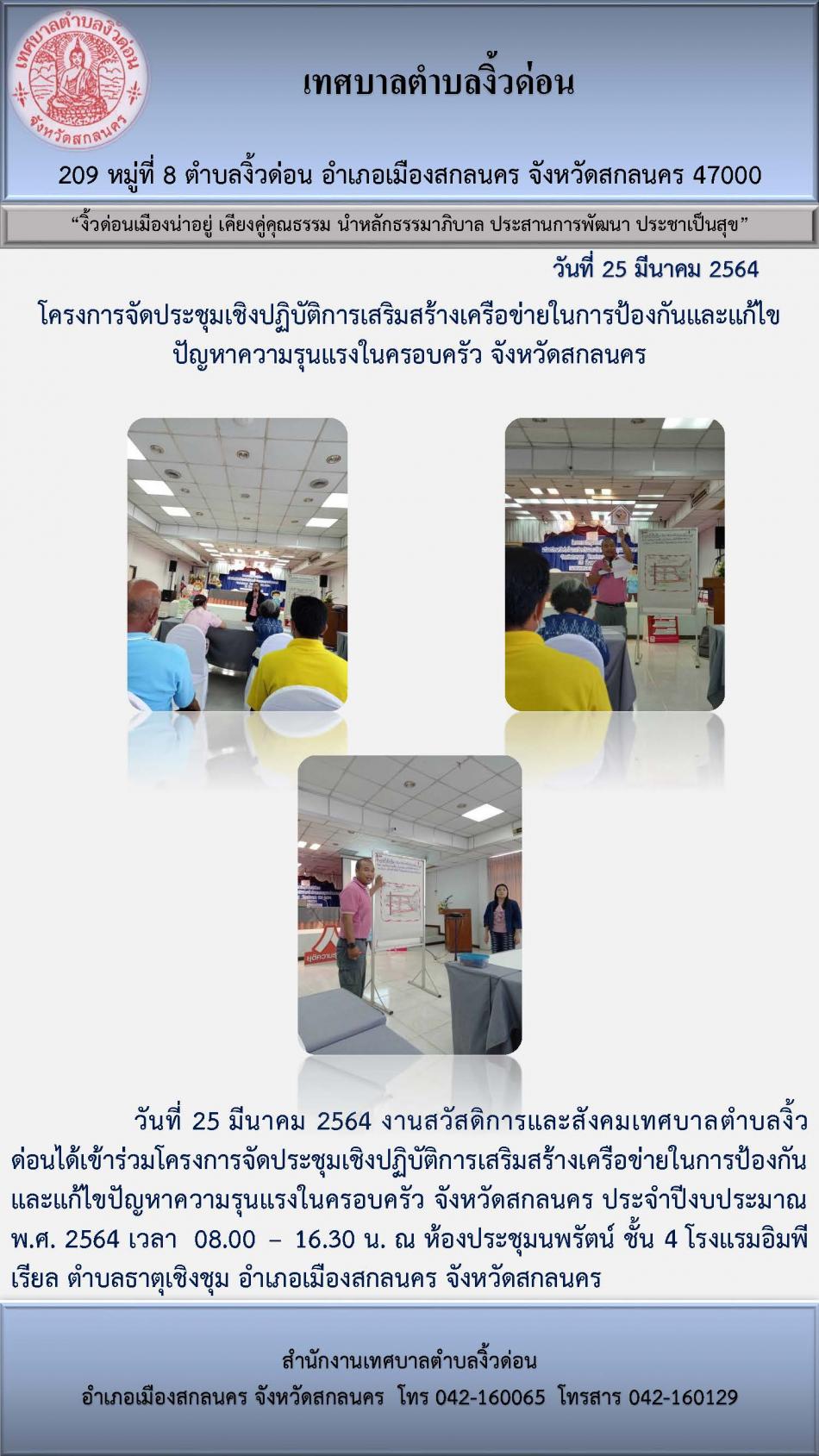 โครงการจัดประชุมเชิงปฏิบัติการเสริมสร้างเครือข่ายในการป้องกันและแก้ไขปัญหาความรุนแรงในครอบครัว จังหวัดสกลนคร [25 มีนาคม 2564]