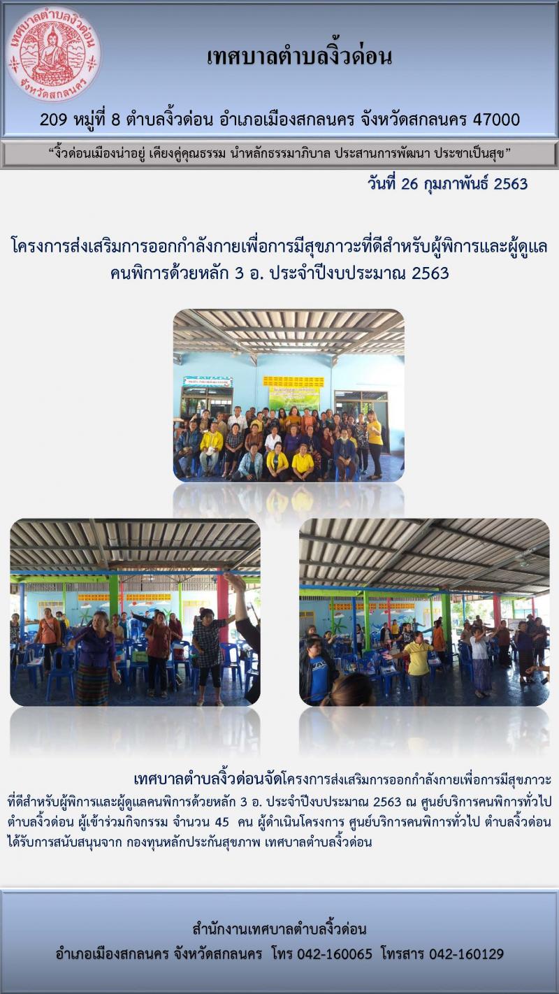โครงการส่งเสริมการออกกำลังกายเพื่อการมีสุขภาวะที่ดีสำหรับผู้พิการและผู้ดูแลคนพิการด้วยหลัก 3 อ. ประจำปีงบประมาณ 2563