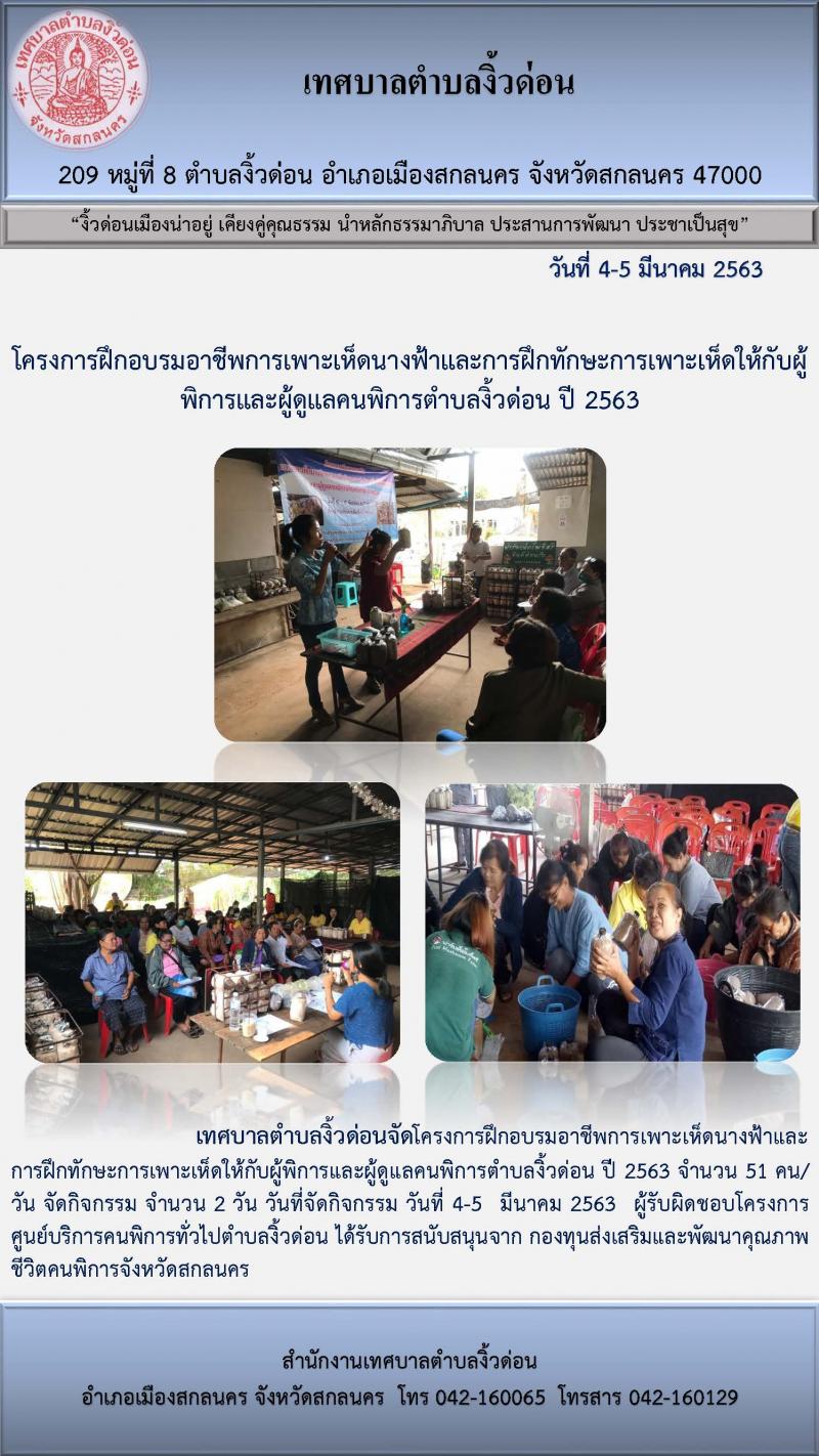 โครงการฝึกอบรมอาชีพการเพาะเห็ดนางฟ้าและการฝึกทักษะการเพาะเห็ดให้กับผู้พิการและผู้ดูแลคนพิการตำบลงิ้วด่อน ปี 2563