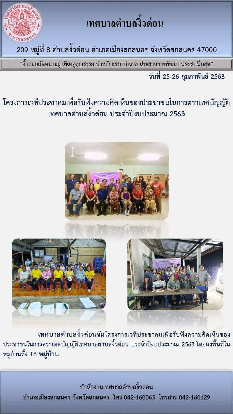 โครงการเวทีประชาคมเพื่อรับฟังความคิดเห็นของประชาชนในการตราเทศบัญญัติเทศบาลตำบลงิ้วด่อน ประจำปีงบประมาณ 2563