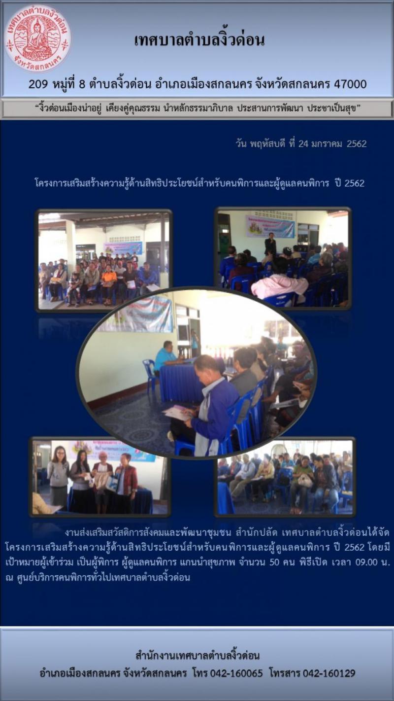 งานส่งเสริมสวัสดิการสังคมและพัฒนาชุมชน จัดโครงการเสริมสร้างความรู้ด้านสิทธิประโยชน์สำหรับคนพิการและผู้ดูแลคนพิการ ปี 2562 (9 ภาพ)
