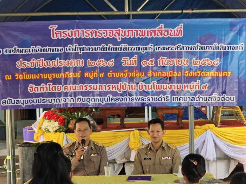 นายกเทศมนตรีตำบลงิ้วด่อน มอบหมายให้รองนายดเทศมนตรี พร้อมด้วยกำนันตำบลงิ้วด่อน ร่วมเปิดโครงการตรวจสุขภาพเคลื่อนที่ตามพระราชดำริ หมู่ที่ 9 บ้านโพนงาม [15 กันยายน 2568]